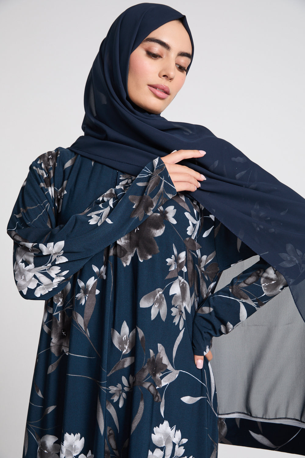 Premium Floral Jersey Closed Muhabbath with Front Zip - Blue