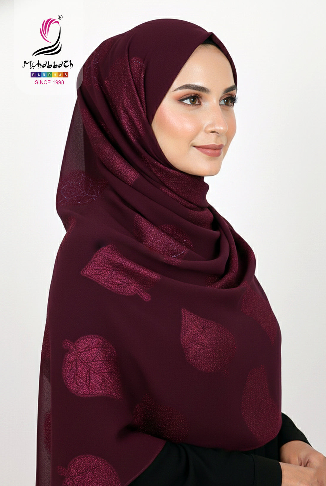 Muhabbath Fancy Leaf Printed Chiffon Shawl - Maroon